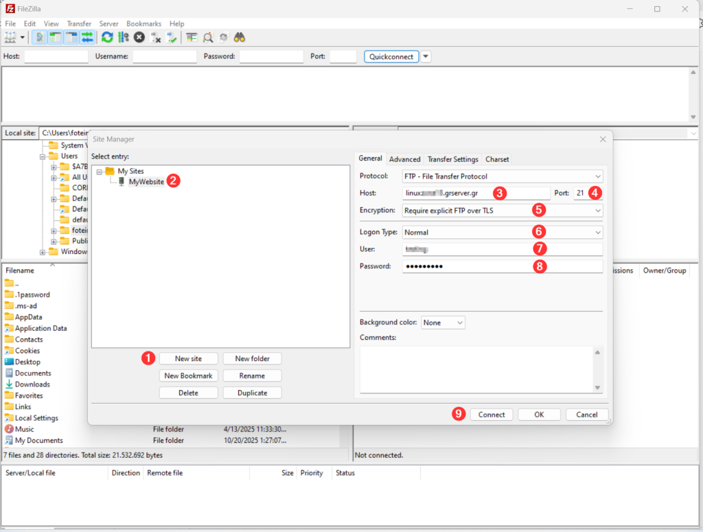 Κατεβάστε το FileZilla, από εδώ. Αφού το εγκαταστήσετε, ακολουθήστε τα παρακάτω βήματα για να συνδεθείτε.